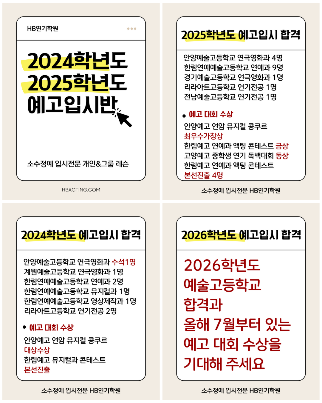 안녕하세요. 강남 소수정예 입시전문 [HB연기학원]입니다. 우리 학원은 2025년 8월 - 연극영화과/뮤지컬과/방송연예과 입시를 준비하는 중고등학생 & 재입시생을 위한 모든 커리큘럼을 오픈하였습니다.